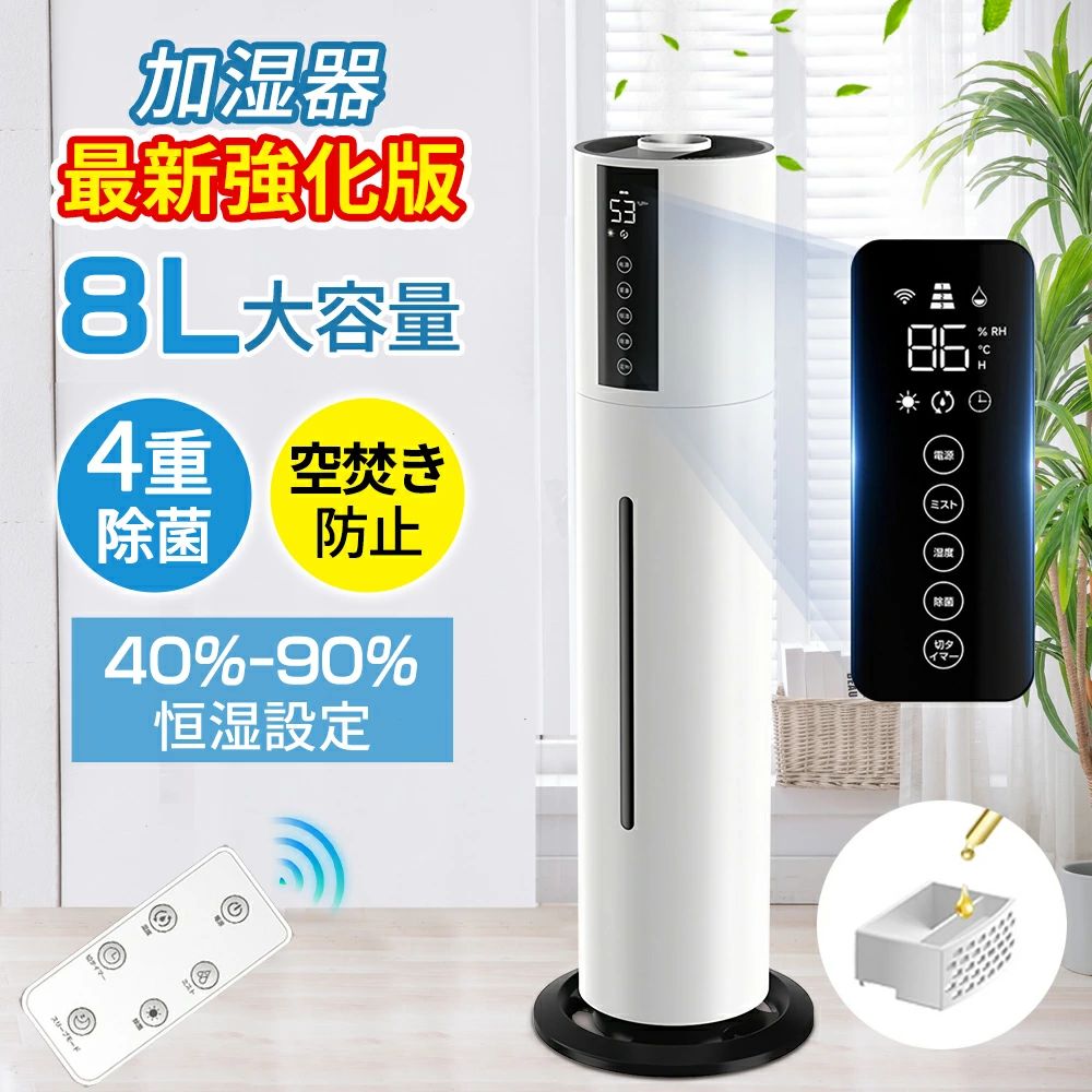 加湿器 タワー型 8L大容量 超音波式 スチーム式 ハイブリッド式 卓上 加湿機 4重除菌 次亜塩素酸水対応 40畳 3段階ミスト調節 上から給水 長時間連続加湿 静音 切タイマー 恒湿 AI湿度調整 加湿器 小型 おしゃれ アロマ対応 吹出し口360°回転 省エネ 乾燥防止
